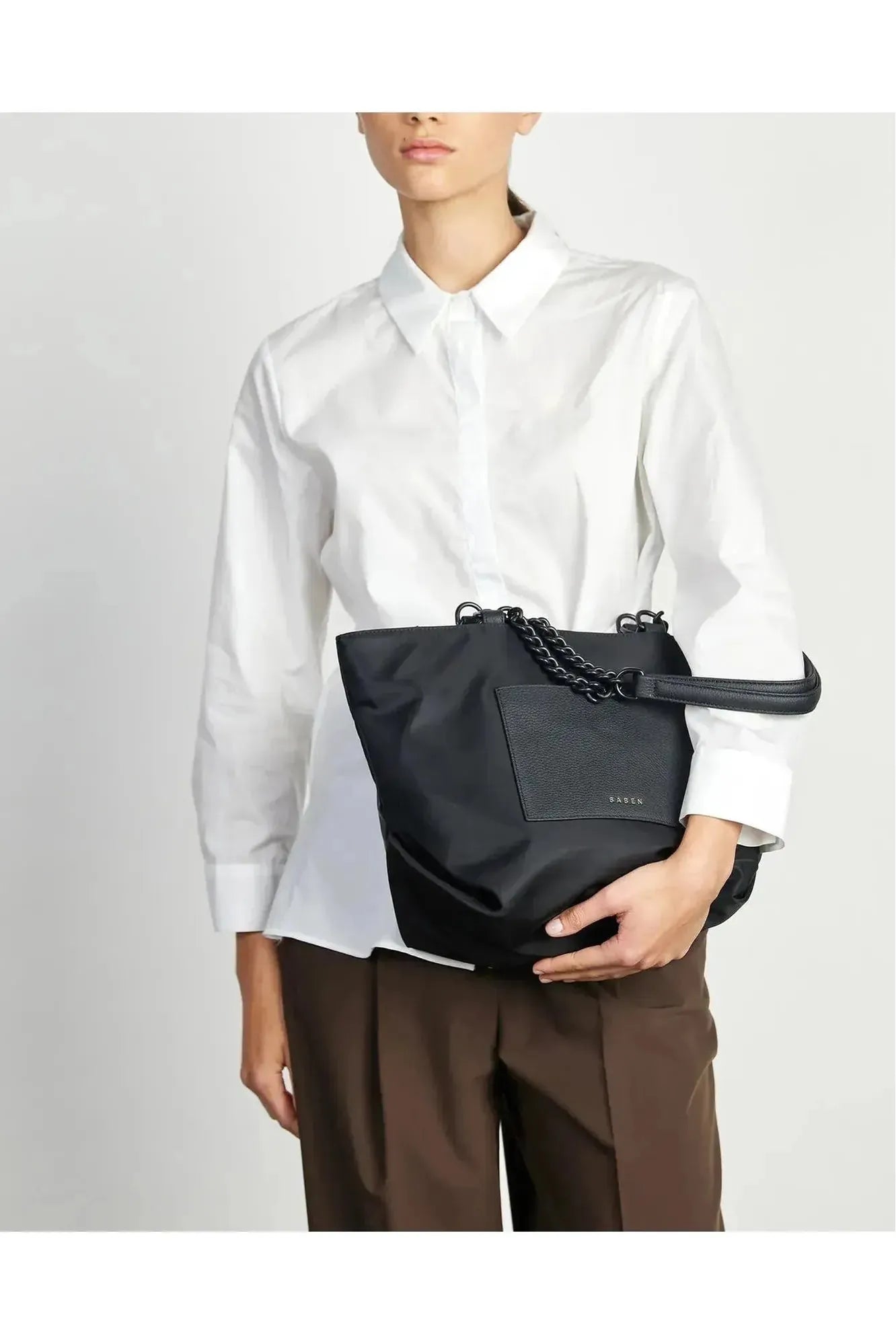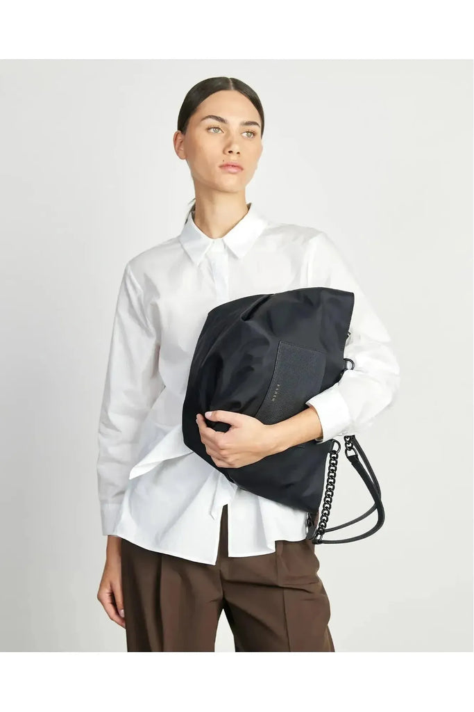 Introducing the Paris tote, made with innovative heavy duty recycled nylon that is both lightweight and timeless. Thoughtfully designed, Paris’ handles have been made to tuck inside the bag, so you can switch from shoulder bag to top handle tote at a moment’s notice. Feature chain strap handles with leather shoulder rests make for a comfortable commute.
