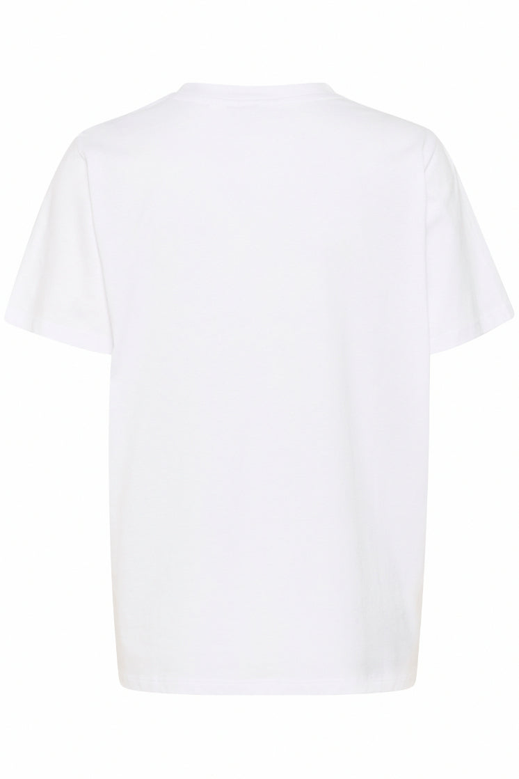White T-shirt with front print featuring a red apple and the text “Pomme d'Amour” in blue and red. Designed in soft cotton jersey with a relaxed fit, short sleeves, and a round neckline.