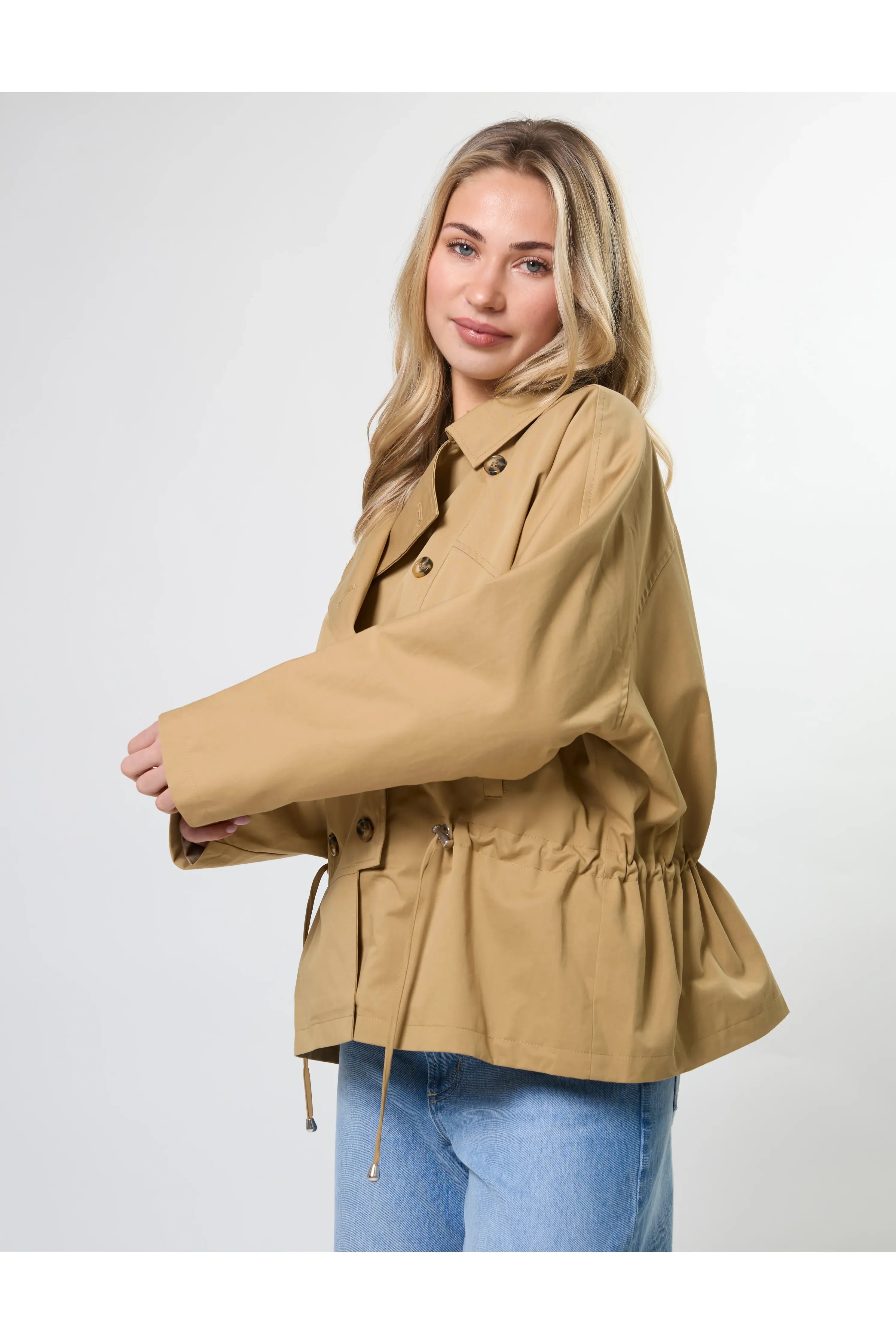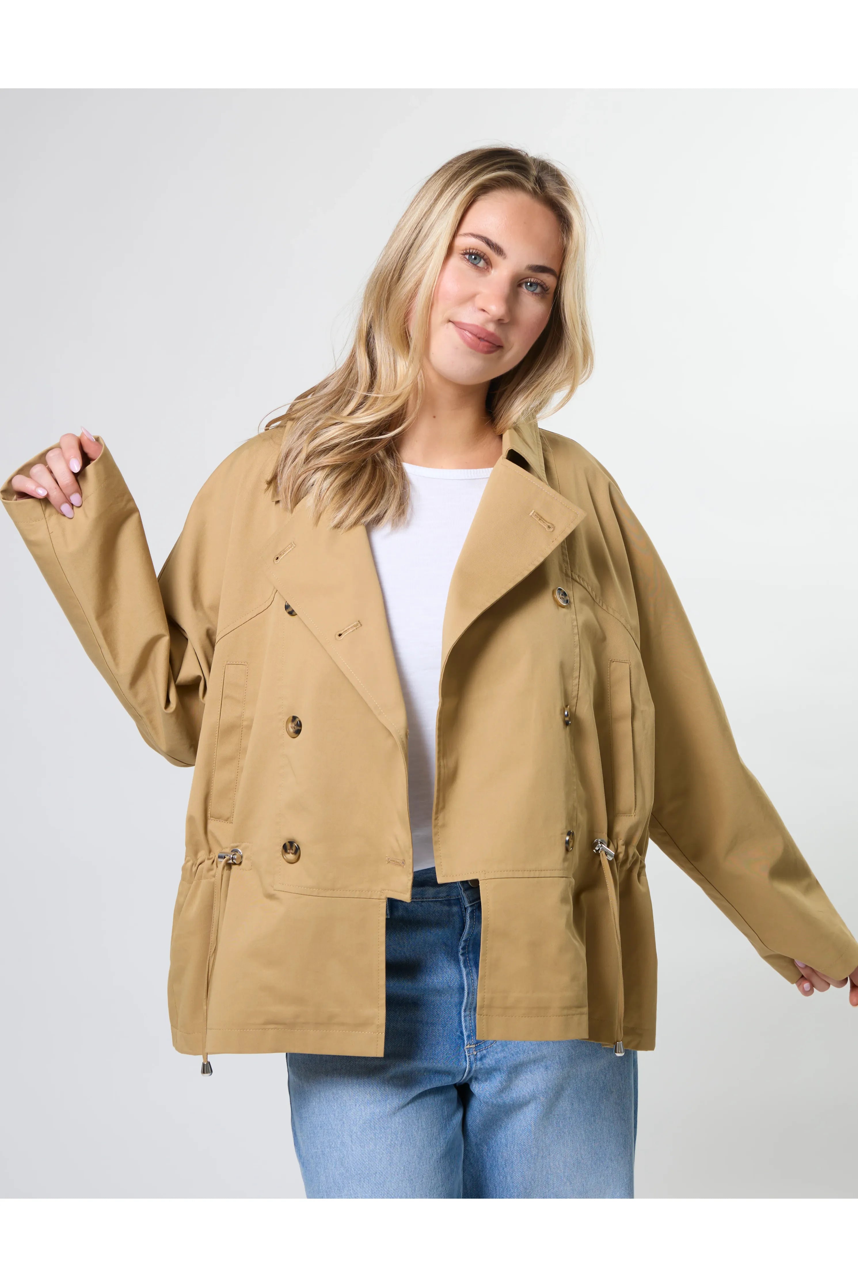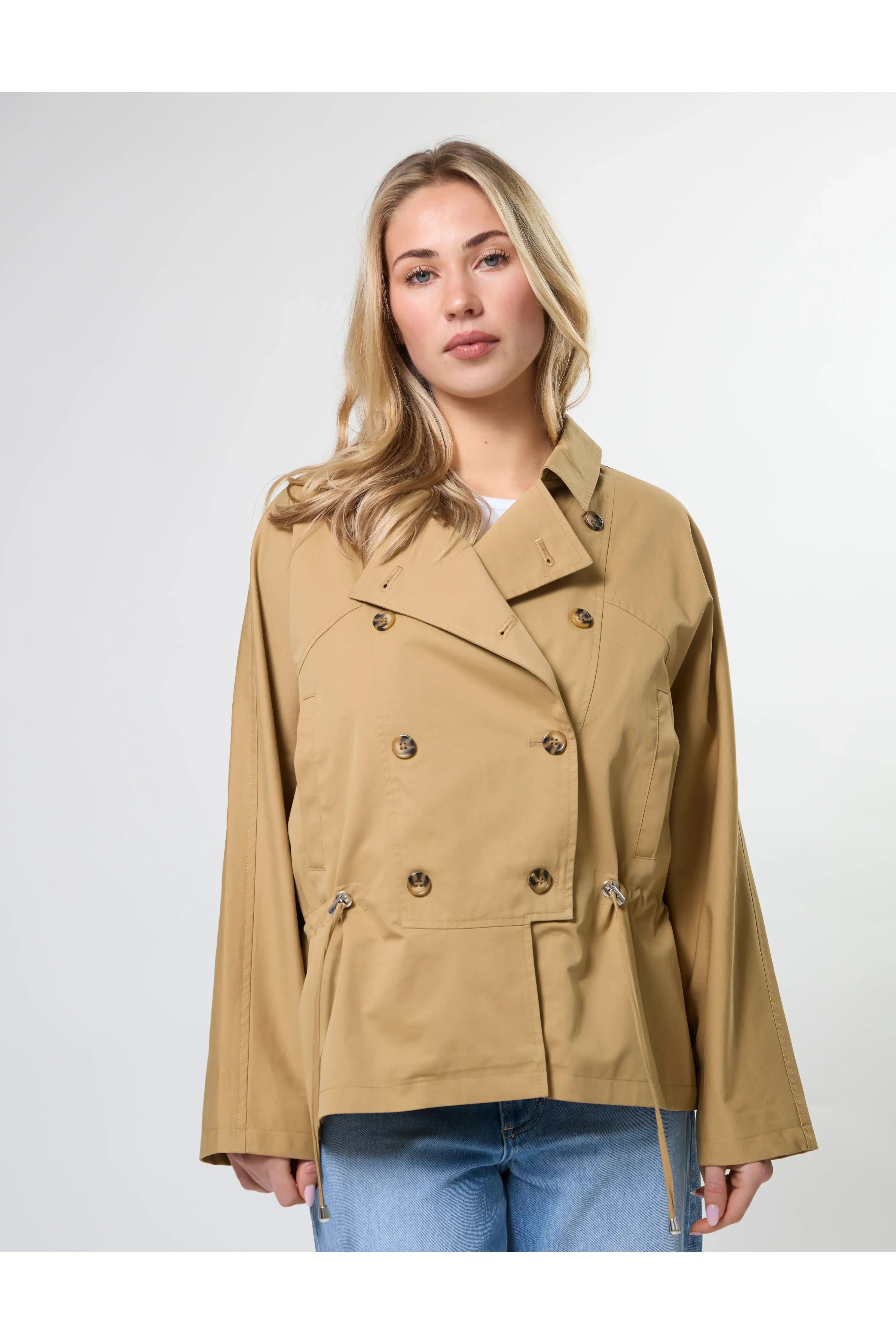 Lightweight double-breasted jacket with collar, adjustable elasticated cord tie with toggle through waist and welt pocket detail.