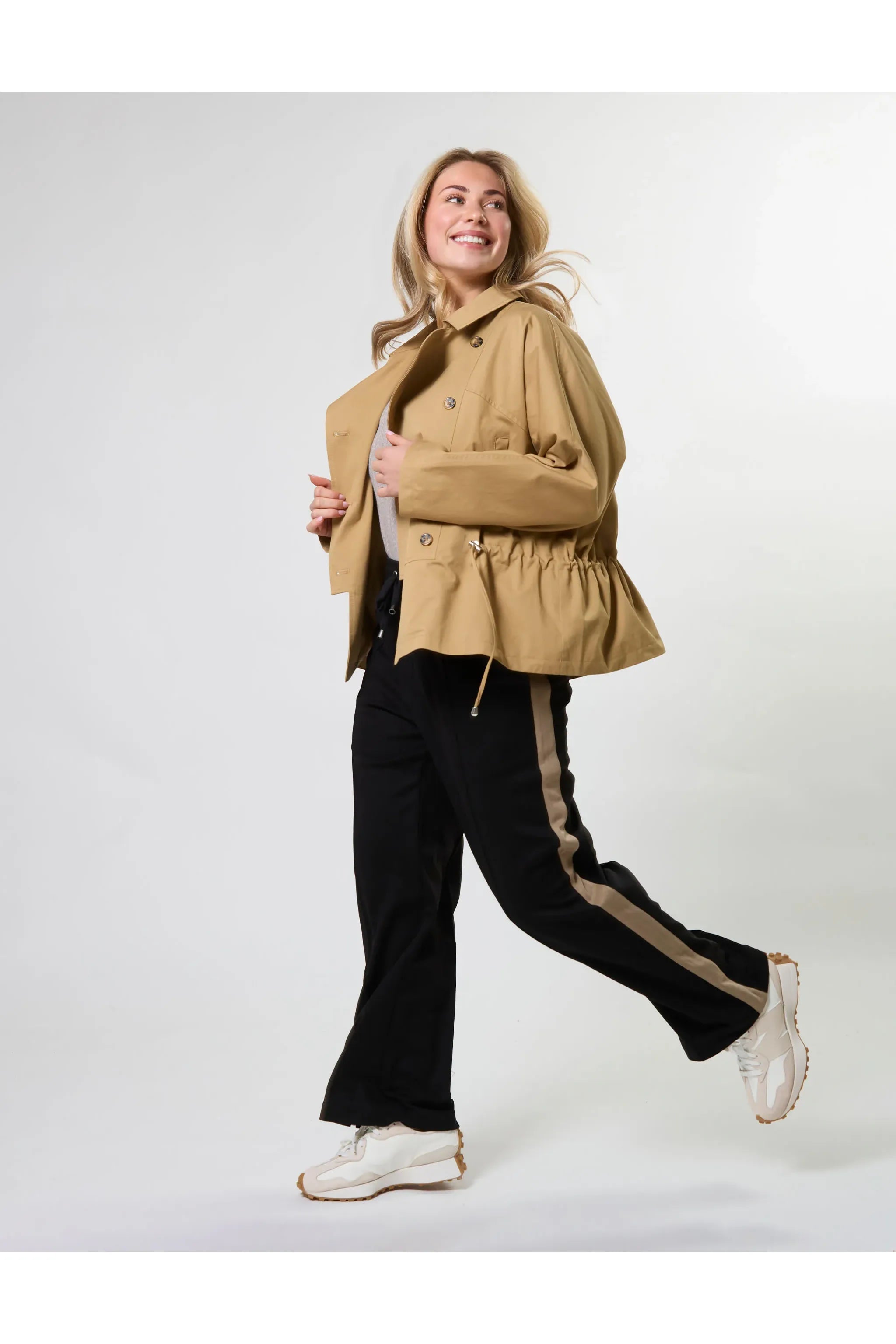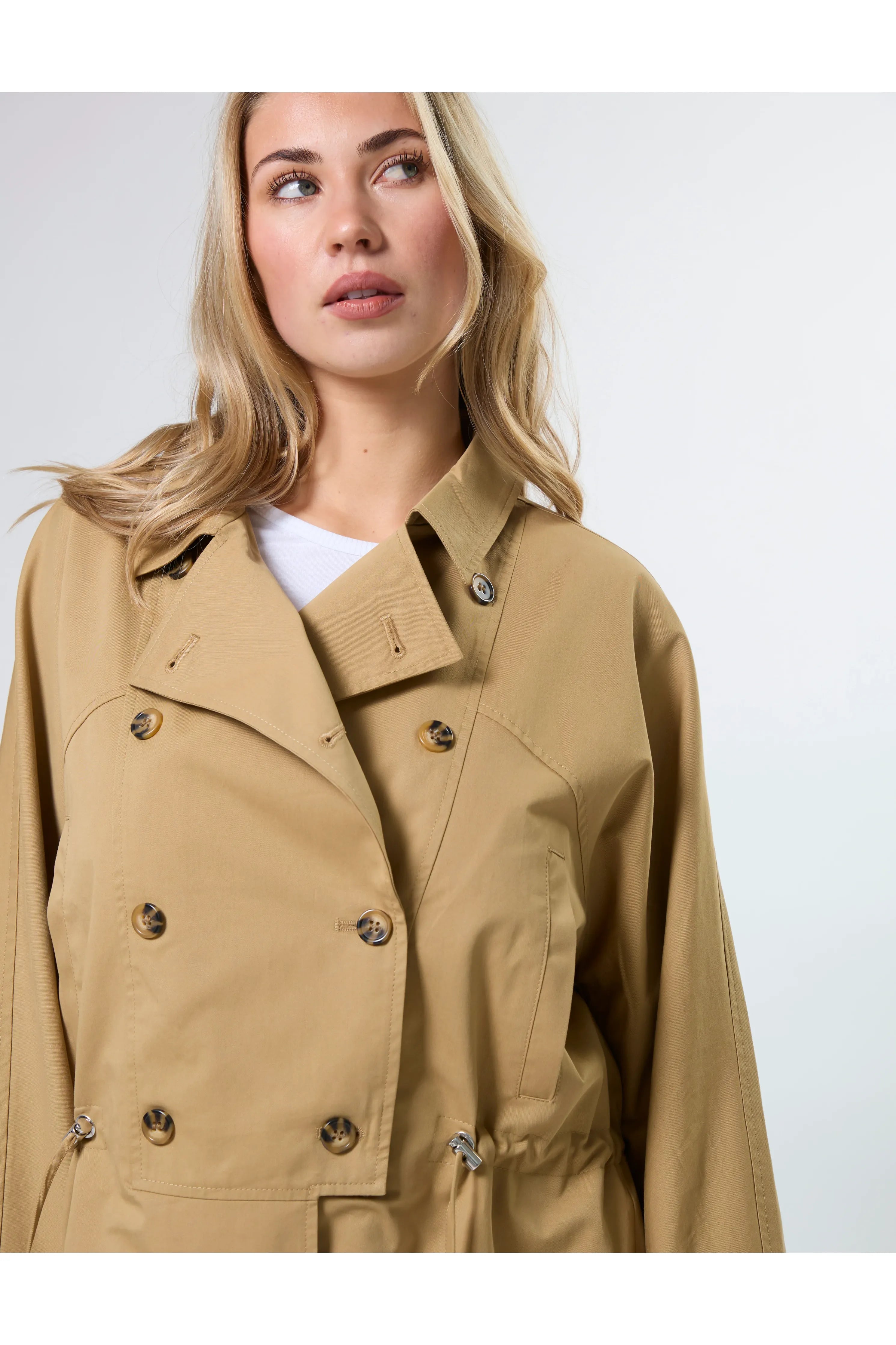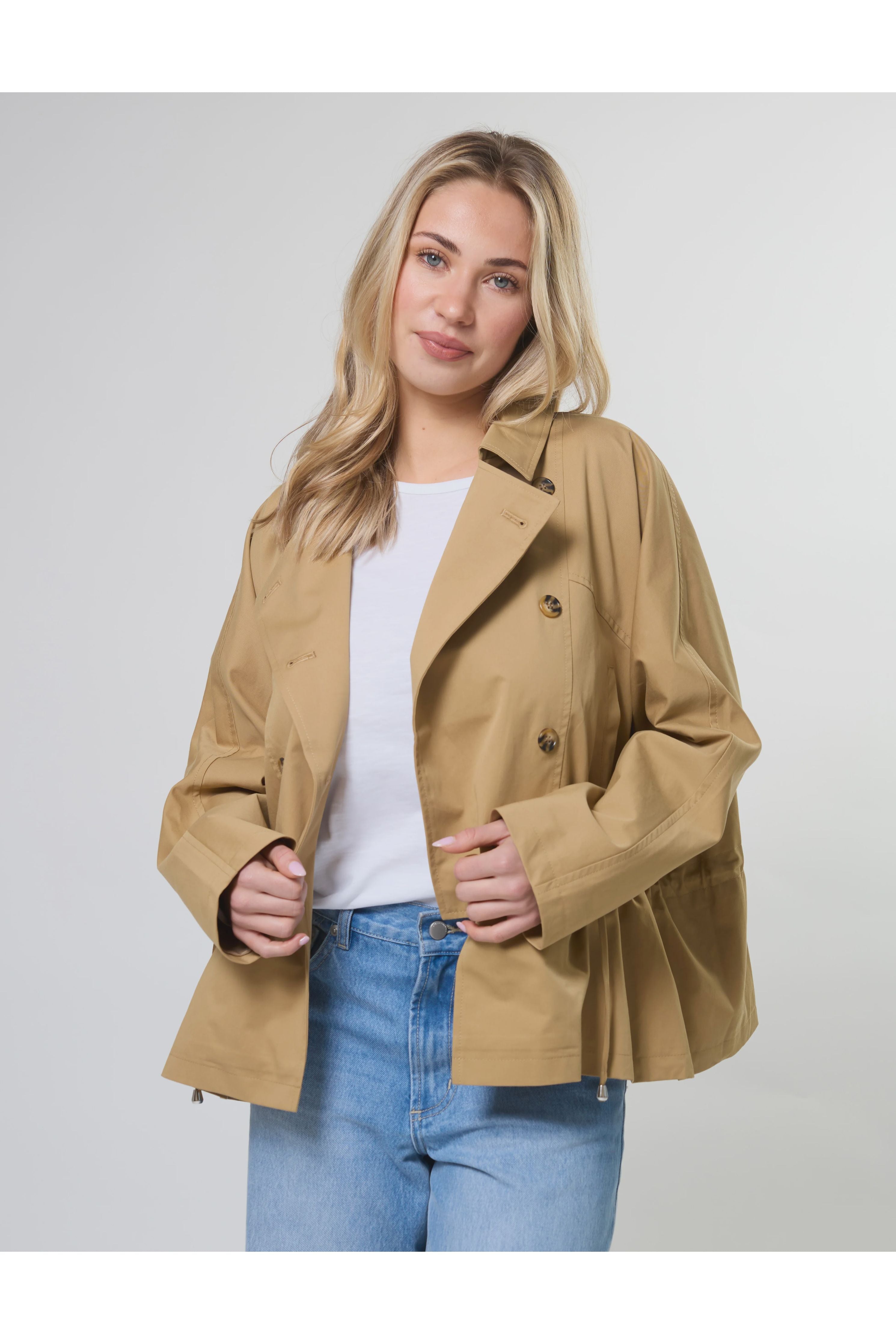 Lightweight double-breasted jacket with collar, adjustable elasticated cord tie with toggle through waist and welt pocket detail.